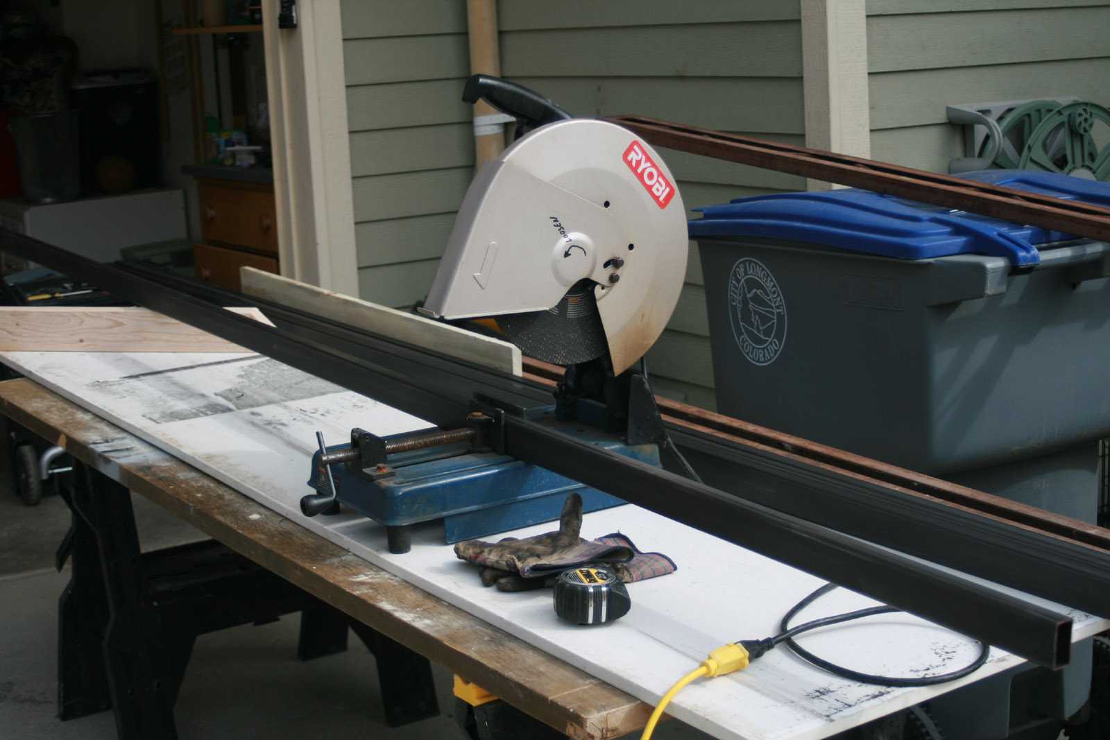 Like a single-purpose stationary grinder with a massive 14″ cutting wheel, this low-tech behemoth can make rapid and fairly clean cuts across the pieces of tube steel shown in my diagram above. It clamps the tube in place, and you lower the cutting head down to make the chop. There is an angle setting, allowing you to make corner joints and other useful cuts.