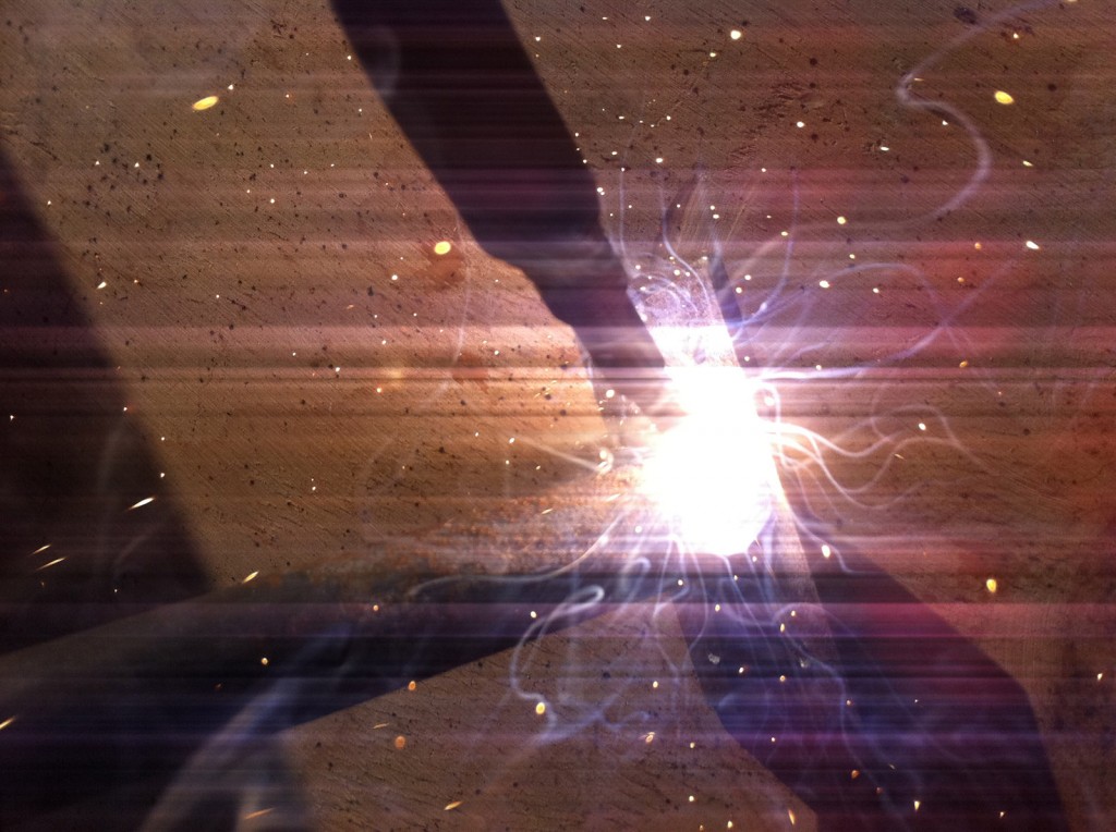 - Lower your visor, position the gun, brace yourself and squeeze the trigger. You’re welding! Sparks are flying, a quiet sparkling firecracker sound emerges from your work, and a small amount of hot smoke is swirling about. You see the small orange pool of molten steel forming at the tip of your gun. You keep squeezing, and slowly move the gun, which makes the pool of liquid metal spread along the joint. The area you left behind rapidly cools, and becomes a strong bond. The more slowly and accurately you control your liquid pool, the better the quality of your welding.