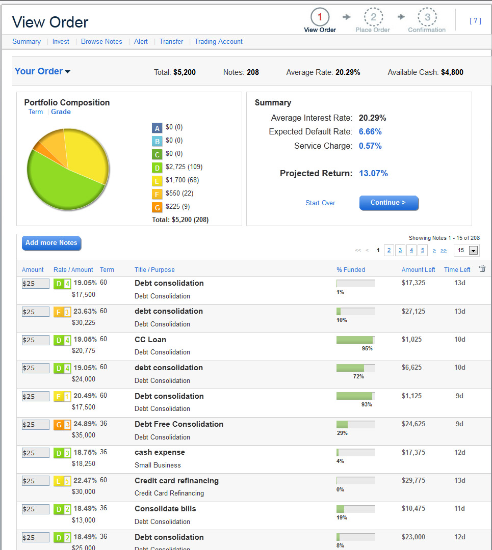 The key difference is that when I requested that my full $10,000 portfolio be invested in Option 3, it ended up allocating the whole ‘stash across only 60 notes. That’s $166 per note, more than six times the minimum $25-per-note investment. With all other things being equal, I would prefer to spread the capital across the greatest number of qualifying loans, because it will reduce the “unique risk” in my portfolio without decreasing returns.