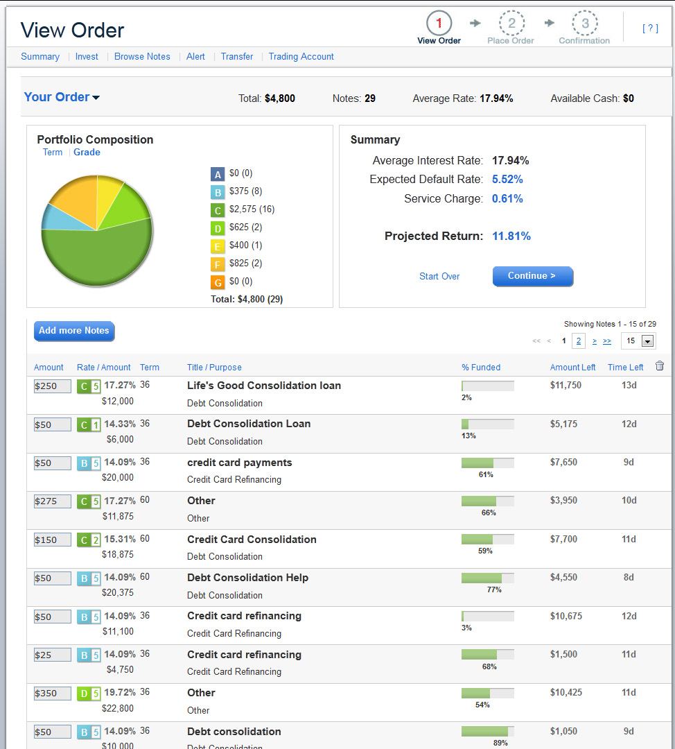 So I logged into my new Lending Club and implemented the same filter there. By checking and unchecking various boxes on Lending club investment screen, I was able to include and exclude loan applications (called “Notes”) with various characteristics. Each time I adjusted my filters, an adjusted list of qualifying notes would appear – usually somewhere between 200 and 1200 notes. At that point, I was able to click “select all”, and Lending Club would present me with a summary that looked like this:
