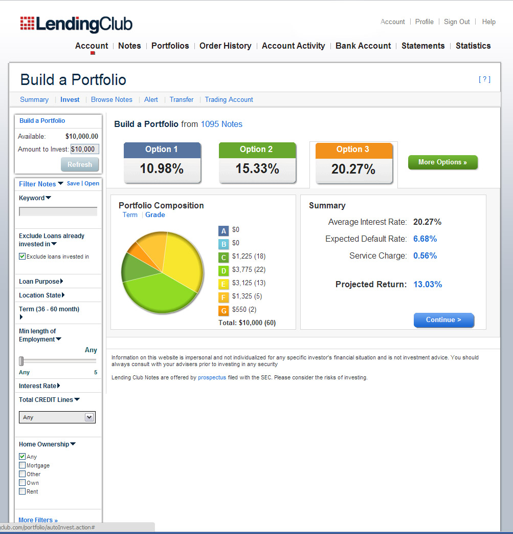 So I was almost ready to invest. The only question was whether to use the manual loan selection method shown above, or the automatic “Build Portfolio” feature provided on your home screen when you first log into Lending Club. Here’s an example of what that looks like: