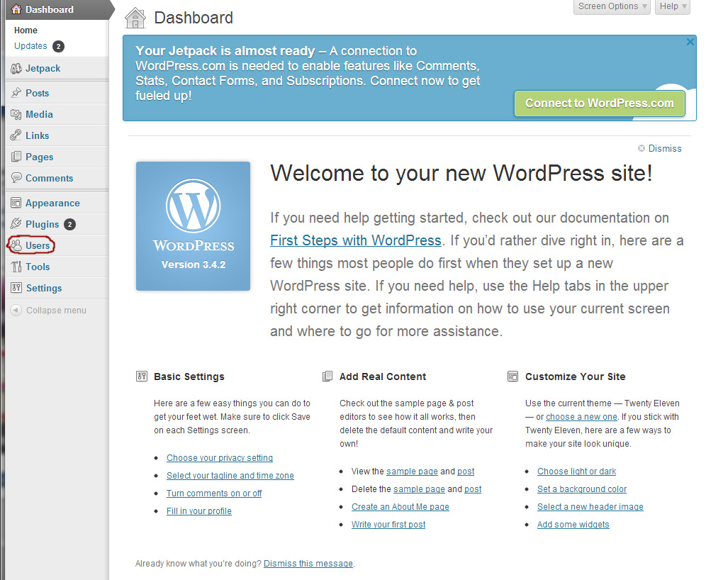 Step 3 – you may have noticed that your dashboard gave you a notice to sign up for a WordPress.com account. This is an account with the actual WordPress company, which is different from the accounts just created here on your own server.