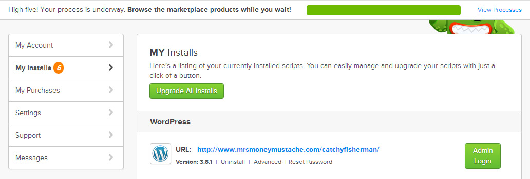 Your wordpress blog is up and running already!  You’ll now see the site in the “My Installs” section. Check it out by going to the URL (in my case: www.mrsmoneymustache.com/catchyfisherman) or login to the admin section of your site by clicking the green “Admin Login” button.