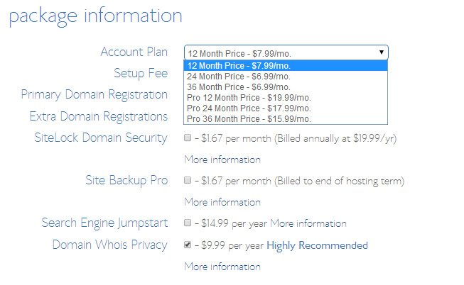 The drop down will show you the current account plan options.  We picked the ‘plus’ plan, when first starting MMM, because I wanted be able to accomodate other hobby sites as well.  No need for a pro package just yet — you can upgrade your site at any time once the traffic is a flowin’. I found basic hosting was good up to at least 10,000 pageviews/day.