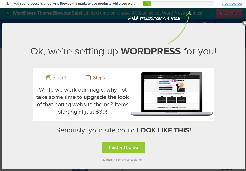 Step 4 – Bluehost will automatically install the whole WordPress system. In the meantime, you can click “No thanks” to their attempt at selling you a theme.  Once this is complete, you will receive an e-mail from Mojo Marketplace letting you know that your new WordPress install is complete. You will also find the information to login to your new site in this e-mail.
