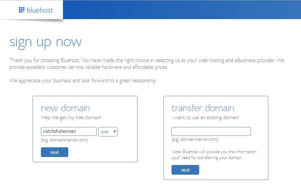 Step 2: If you want to register your newly-invented domain name, enter it on the left.  If you already have one registered elsewhere, enter it on the right.  Since you can register a free domain name with every new account, it might be worth locking in one either way, depending on your needs.  Click Next.