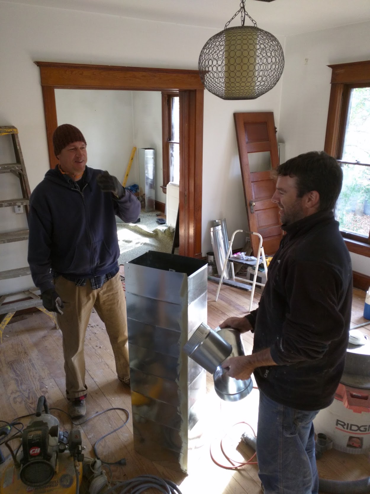 Two local friends exchange witty banter even as they build custom ductwork for a current project house. This was a bigger job as the original 1910 house had no real ducting at all – we had to open up walls and run pipes to every room in the house. Your furnace upgrade will be easier.