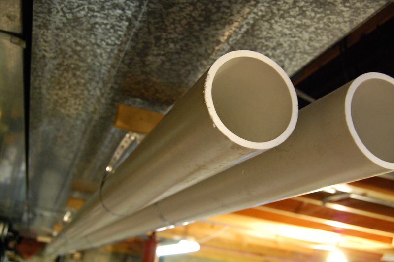Here we are just running two pieces of 3″ PVC pipe (you can even use 2″ for shorter runs) from the furnace to an inconspicuous place on the outside of your house. It’s a fun design puzzle, deciding how to route the pipe and figuring out which fittings to use to accomplish it. Your goal is a classy looking job. You cut it with a miter saw or sawzall, and glue it with purple PVC primer and PVC glue. Again, watch a few videos if you need to learn how to handle this stuff.