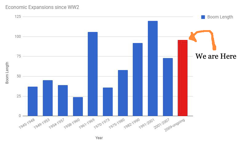 The final piece of evidence comes from just how long the present party has gone on. If you look at the history of economic expansions – how long we have gone since the last recession – we are currently enjoying the third longest one in history:
