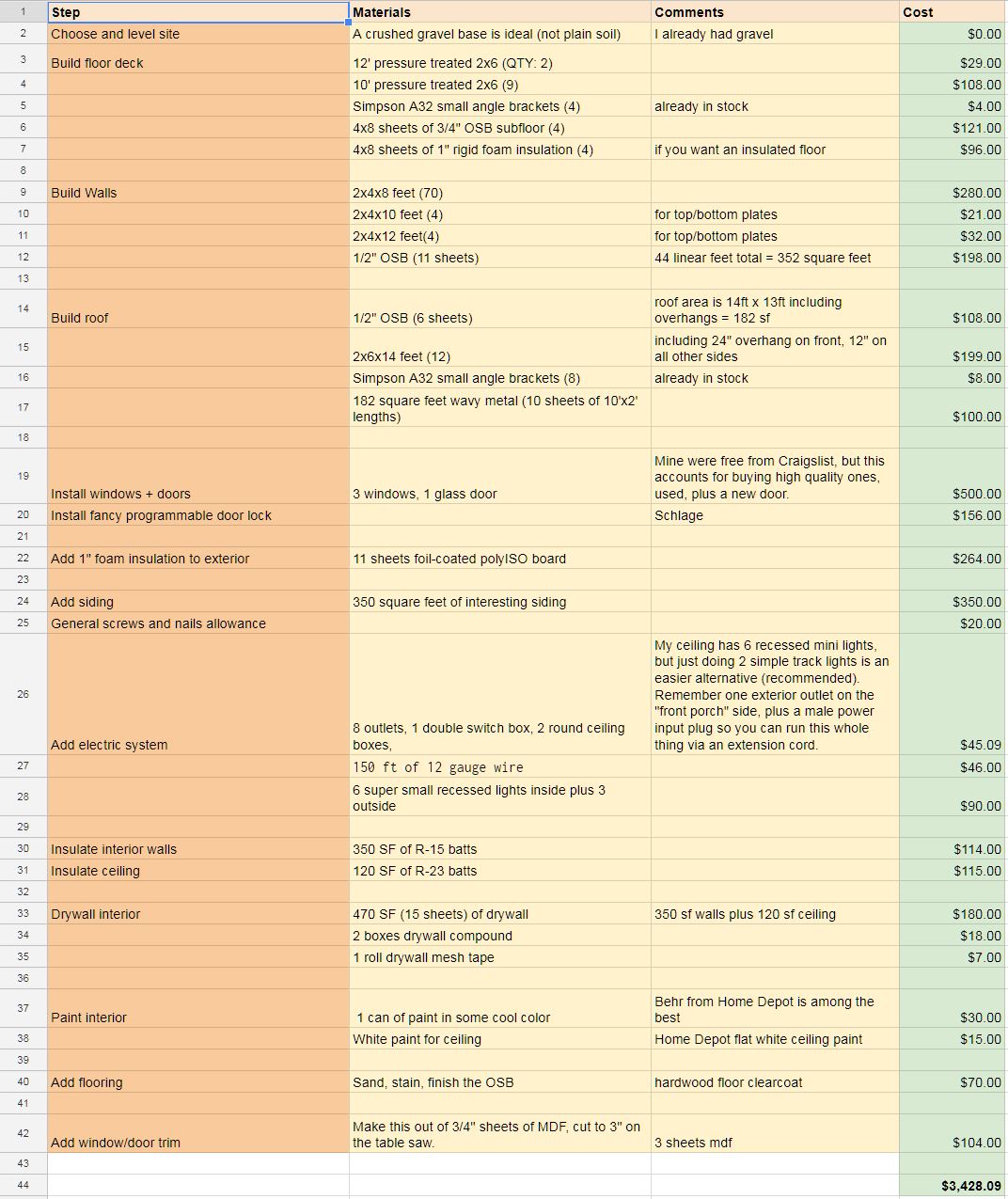 As with any big construction project, I started with a spreadsheet of steps and materials.